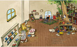 狼先生的书桌附近是我最喜欢的一个角落,书桌四周堆了很多书,下面排列着狼先生平时喜欢读的。小老虎经常躲在这个书桌周围,悄悄观察狼先生的行动,还会偷偷拿出一本书假装在看,为特工队的行动打掩护。书店开在森林里,或许是因为狼先生小时候的经历,他有点儿害怕和小动物们接触,所以选择住在森林深处……就这样,狼先生的书店逐渐成形。